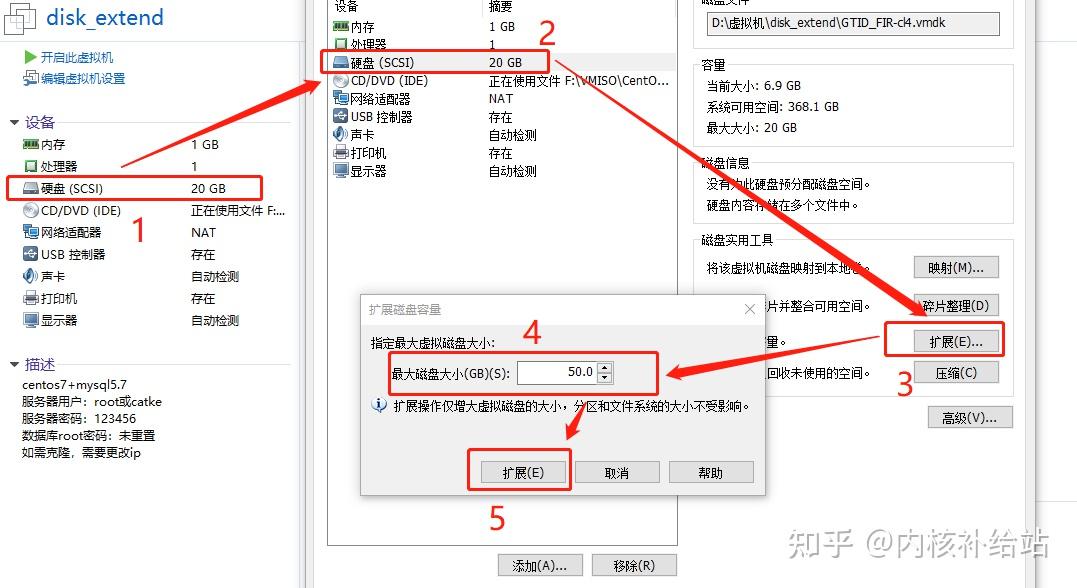 然后左边菜单栏点击硬盘,在弹出的对话框选中硬盘,并点击扩展按钮,然后在弹出框中的最大磁盘大小修改未所需要的磁盘大小,比如我现在需要扩容30G,原本的磁盘大小是20G,所以我这里将原本的20G修改成50G,然后点击扩展