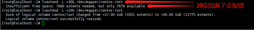 扩容已有的卷组容量(这里有个细节,就是不能全扩展满,比如空闲空间是30G,然后这里的话30G不能全扩展上,这里我扩展的是29G)