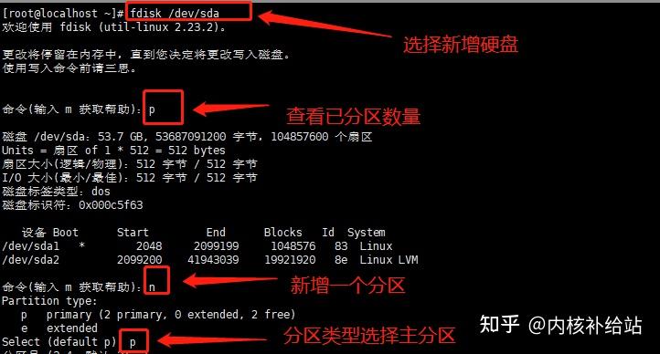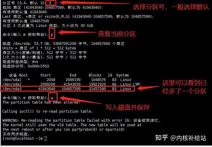 期间,如果需要将分区类型的Linux修改为Linux LVM的话需要在新增了分区之后,选择t,然后选择8e,之后可以将新的分区修改为linux LVM